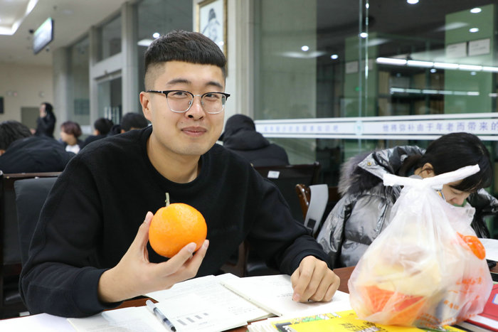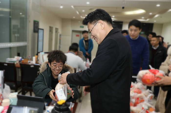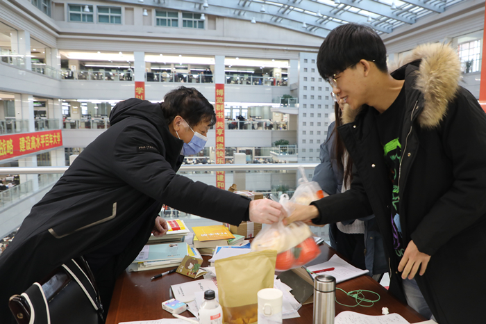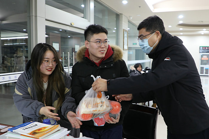 (记者/摄影 许丽娜 樊星)“孩子们,复习累了吧,我们来给你们鼓劲加油,忙着备考之余,别忘了补充营养,我们相信你们一定能行!”12月10日,我校领导孙明学、蒋明虎、郝丽红、牟海维、于长青、张亚志和各二级学院、学生工作部相关人员走进图书馆,看望慰问正为考研做最后复习冲刺的学子们。寓意心想事成、步步登高、牛气冲天的橙子、面包和牛奶装满了“暖心福袋”,校领导和老师们亲手把福袋送到考研学子们手里,也把一份份承载着全校师生祝福的暖意和心意送到了学子们心里。