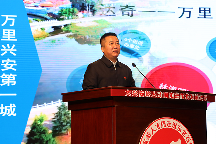 孟祥志做主题宣讲,介绍了加格达奇区人才引进相关情况。大兴安岭地区人力资源和社会保障局局长潘滨对本次招聘的人才引进政策做了介绍。我校优秀校友代表、大兴安岭地区行署办公室副主任刘伟向毕业生分享了在大兴安岭工作生活的经历。