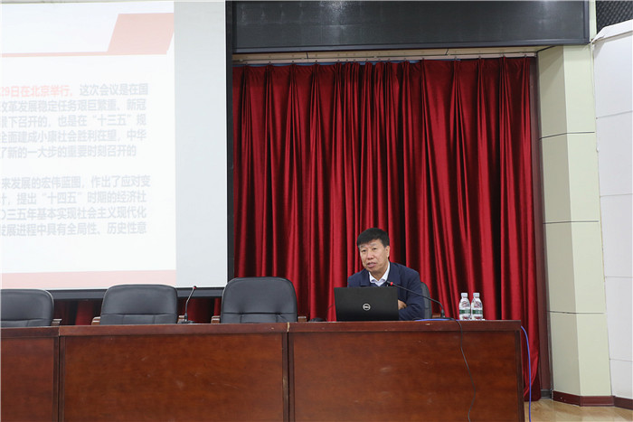 12月21日,副校长高洪峰在机关楼一楼会议室宣讲党的十九届五中全会精神、省委十二届八次全会精神,地球科学学院、电气信息工程学院、非常规油气研究院、人事处、国有资产管理处、实验室与设备管理中心、图书馆、高等教育研究中心党员参加宣讲会。会议由国有资产管理处处长赵天华主持。