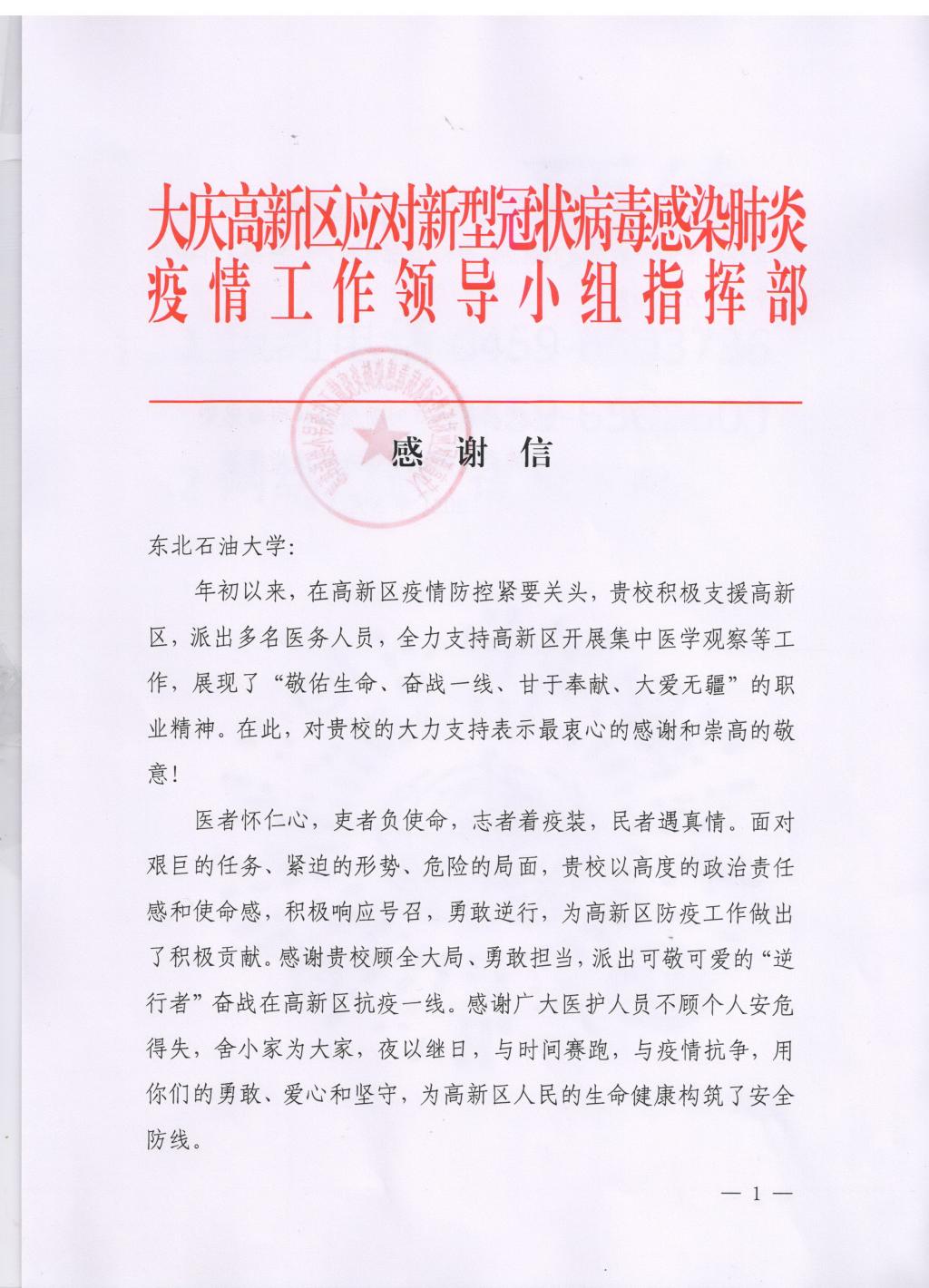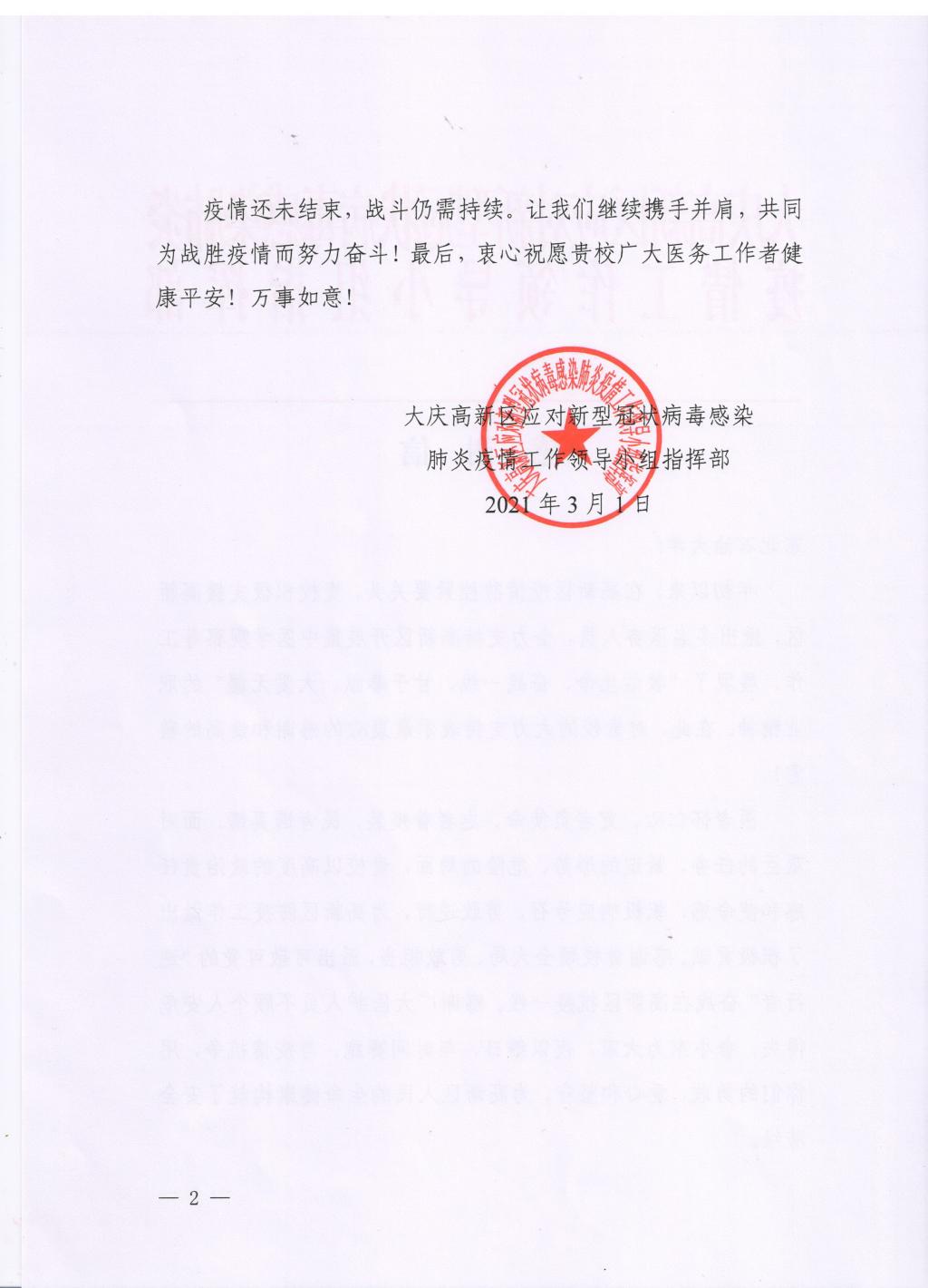 大庆高新区疫情防控指挥部为我校送来感谢信