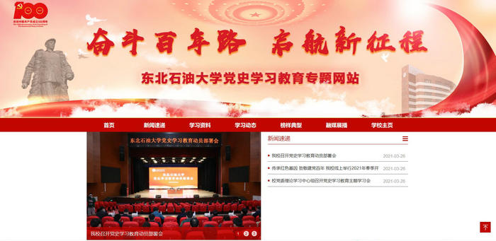 (记者 许丽娜)4月1日,我校党史学习教育专题网站正式上线。网站设立“新闻速递”“学习资料”“学习动态”“榜样典型”“融媒展播”五大板块,全面梳理刊发习近平总书记关于党史的系列重要论述和其他重要讲话精神,全景展示我校党史学习教育开展的最新动态,集中宣传东油人听党指挥跟党走、服务能源、科研报国、潜心育人、爱岗敬业的典型事迹,成为东油师生学史明理、学史增信、学史崇德、学史力行的重要交流展示平台。
