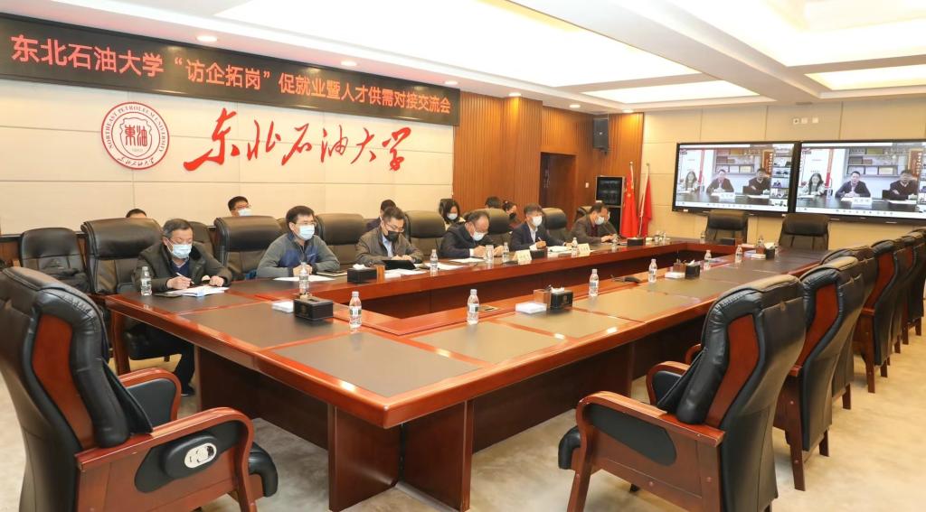 (记者/摄影 许丽娜)为扎实开展高校书记校长“访企拓岗”促就业专项行动,全面加强校企联动、协同育人,促进学校毕业生更加充分更高质量就业,4月8日,我校在机关五楼会议室举行“访企拓岗”促就业暨人才供需对接交流会,“面对面”与来自“三桶油”17家石油石化企业围绕就业、人才培养、科学研究等方面线上作深入交流。校党委书记付晓飞、副校长高洪峰及招生就业处、教务处、地球科学学院、石油工程学院、化学化工学院、机械科学与工程学院、电气信息工程学院相关负责人参加会议。会议由高洪峰主持。