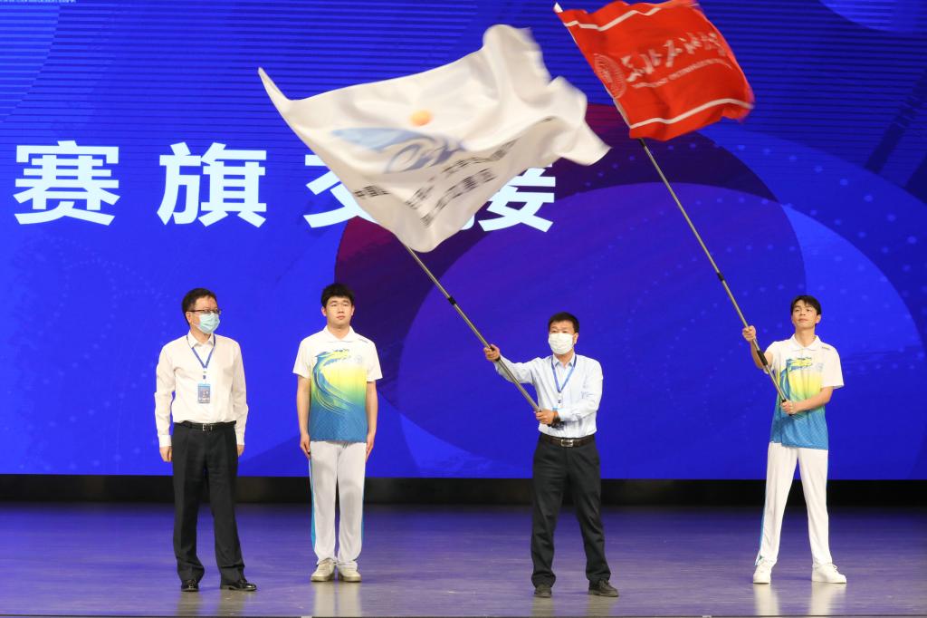 仪式上,我校副校长高洪峰从上届大赛承办校黑龙江八一农垦大学副校长崔卫国手中接过“互联网+”省赛会旗。