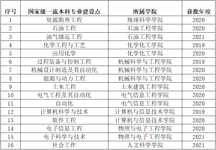 (通讯员 朱雪晴 记者 吕鸿浩)日前,教育部发布了《教育部办公厅关于公布2021年度国家级和省级一流本科专业建设点名单的通知》(教高厅函〔2022〕14号),我校社会工作、电子科学与技术、油气储运工程等3个专业获批2021年度国家级一流本科专业建设点,地质学、地球化学、建筑环境与能源应用工程、安全工程、工程管理等5个专业获批2021年度省级一流本科专业建设点。至此,我校已有省级及以上一流本科专业建设点27个,其中国家级一流本科专业建设点16个。