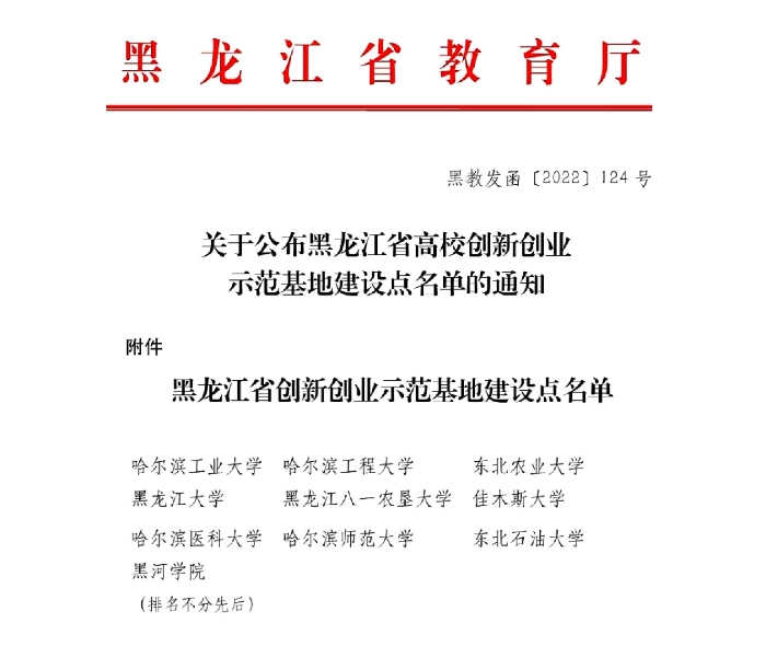近日,黑龙江省教育厅公布了黑龙江省高校创新创业示范基地建设点名单,认定了10所高校创新创业示范基地建设点,我校成功入选。