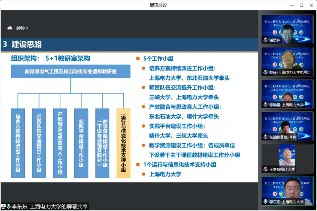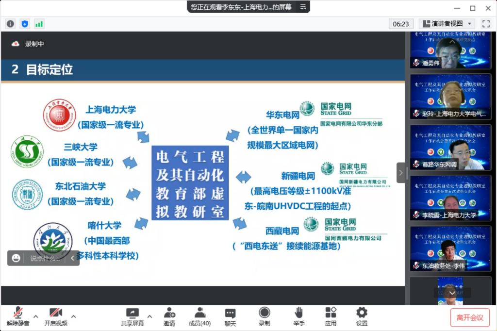 2022年7月26日,我校参与申报的教育部“电气工程及其自动化专业虚拟教研室”建设工作启动会暨首次教研交流会议在线上召开。此次会议由参与申报的上海电力大学、三峡大学、东北石油大学、喀什大学4所高校合办。各校院领导、专业及课程负责人,国家电网有限公司华东分部、新疆公司、西藏公司相关负责人等50余人线上线下参加会议。