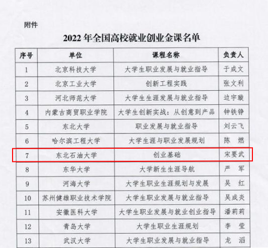 近日,教育部学生服务与素质发展中心下发《关于加强2022年全国高校就业创业金课建设工作的通知》,经高校申报、各省、自治区、直辖市教育主管部门推荐,由教育部学生服务与素质发展中心遴选,确定了20门课程为2022年全国高校就业创业金课。我校宋要武教授负责的创业基础”课程成功入选。