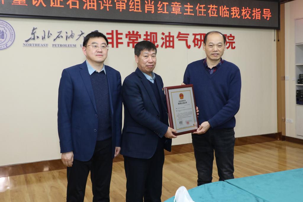 会上,肖红章为东北石油大学页岩油检测中心授牌,颁发国家级检验检测机构资质认定证书。
