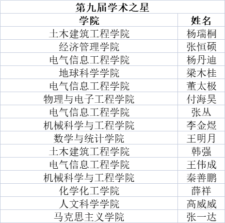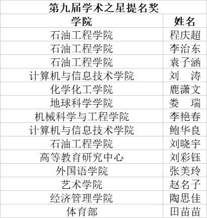 经过激烈角逐,土木建筑工程学院杨瑞桐等5名博士研究生、物理与电子工程学院付海昊等10名硕士研究生获“学术之星”荣誉称号;石油工程学院程庆超等14名研究生获“学术之星提名奖”。